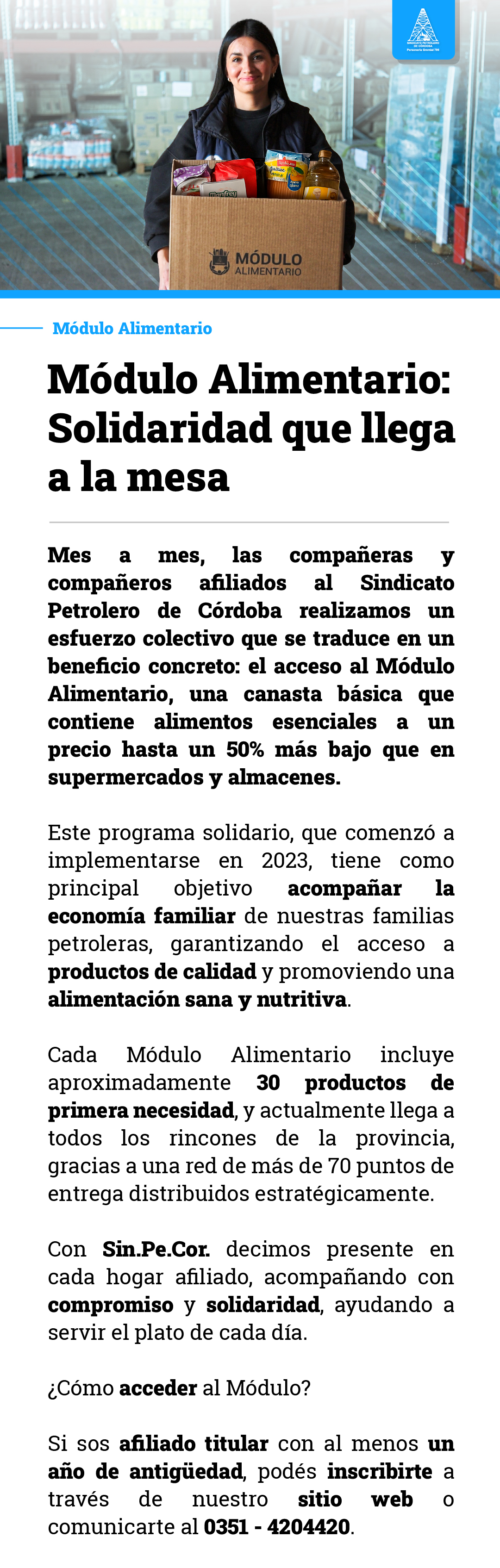 Compañeras y compañeros afiliados al Sin.Pe.Cor realizamos un esfuerzo colectivo que se traduce en un beneficio concreto: el acceso al Módulo Alimentario, una canasta básica que contiene alimentos esenciales a un precio de hasta un 50 más bajo que en supermercados y almacenes.